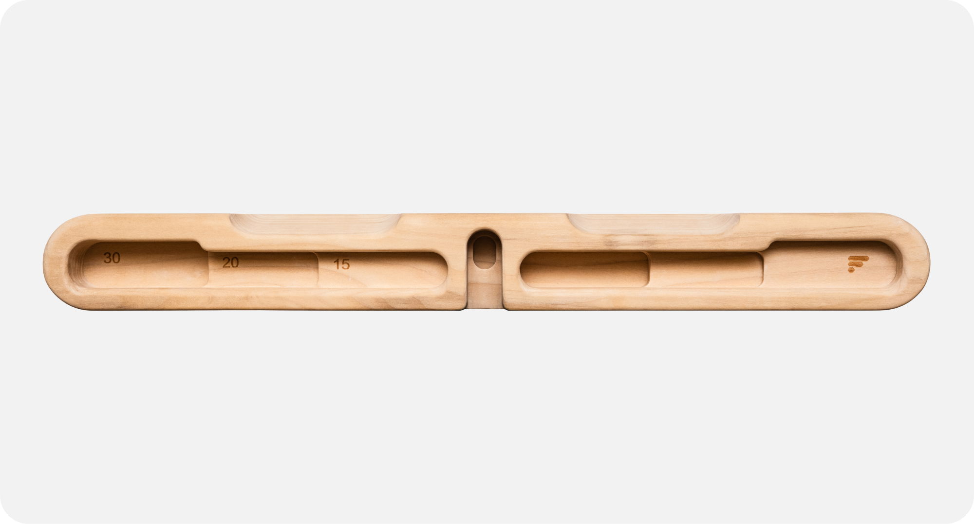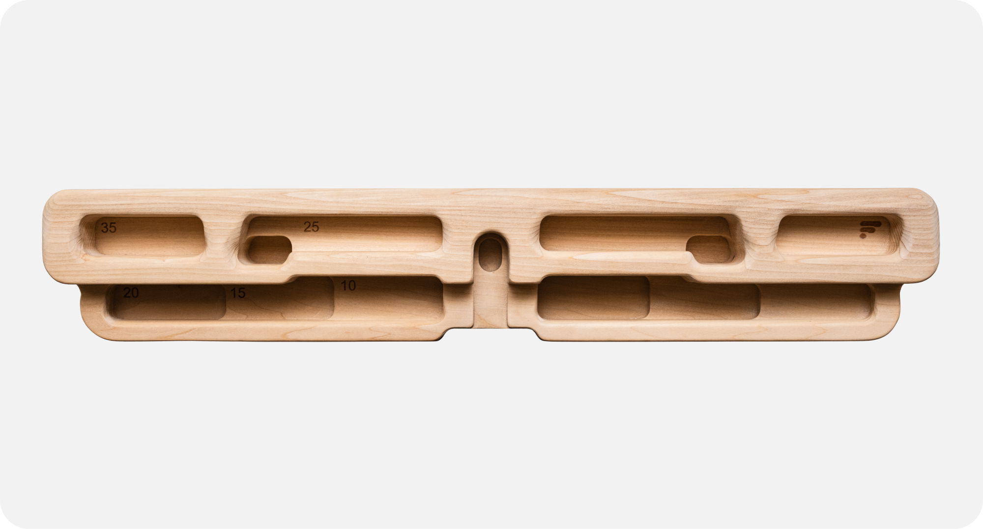We designed this board to offer a complete range for your training. The deep two-finger pockets, a pull-up jug, and edges spanning from 35 to 10 mm make it a versatile board for well-rounded finger strength.